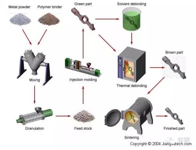 MIM(Metalinjection Molding )是将塑料注射成形技术引入到粉末冶金领域而形成的一种全新的零部件加工技术,MIM工艺产品不仅具有“塑料注射成型”工艺所具有的形状复杂、易于大批量生产的特点,而且具备与精密铸造、锻造接近的物理、化学与机械性能,在制备具有三维复杂几何形状、均匀组织结构和高性能的成形产品方面具有独特的优势。