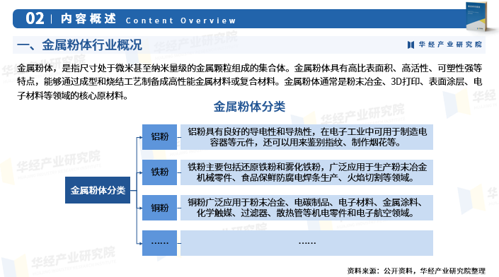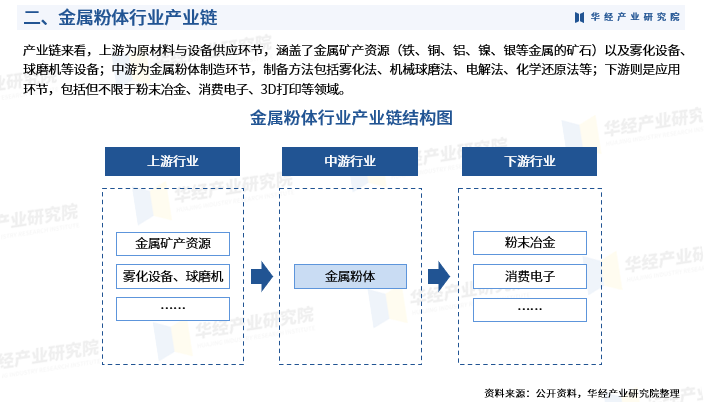 产业链来看,上游为原材料与设备供应环节,涵盖了金属矿产资源(铁、铜、铝、镍、银等金属的矿石)以及雾化设备、球磨机等设备;中游为金属粉体制造环节,制备方法包括雾化法、机械球磨法、电解法、化学还原法等;下游则是应用环节,包括但不限于粉末冶金、消费电子、3D打印等领域。