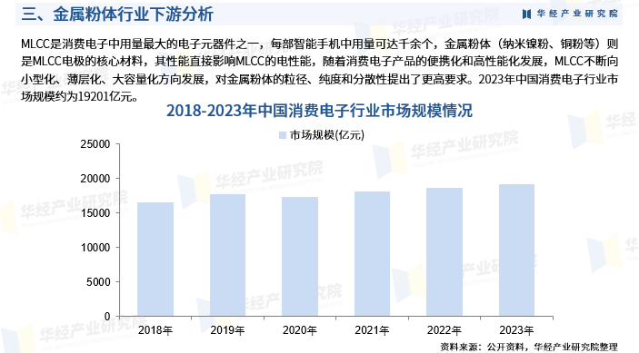 MLCC是消费电子中用量最大的电子元器件之一,每部智能手机中用量可达千余个,金属粉体(纳米镍粉、铜粉等)则是MLCC电极的核心材料,其性能直接影响MLCC的电性能,随着消费电子产品的便携化和高性能化发展,MLCC不断向小型化、薄层化、大容量化方向发展,对金属粉体的粒径、纯度和分散性提出了更高要求。2023年中国消费电子行业市场规模约为19201亿元。